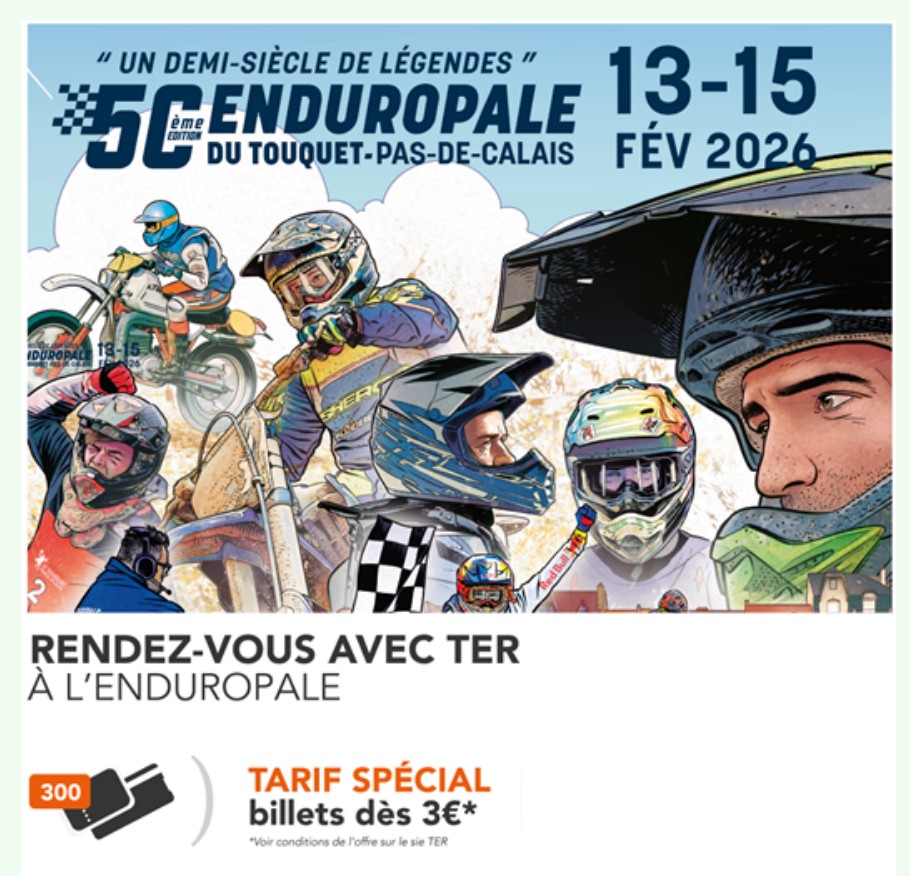 Pour se rendre à l’Enduropale du 13 au 15 février, 300 billets TER Hauts-de-France de 3 à 22€ sont actuellement en vente sur le site TER Hauts-de-France. ter.sncf.com/enduropale