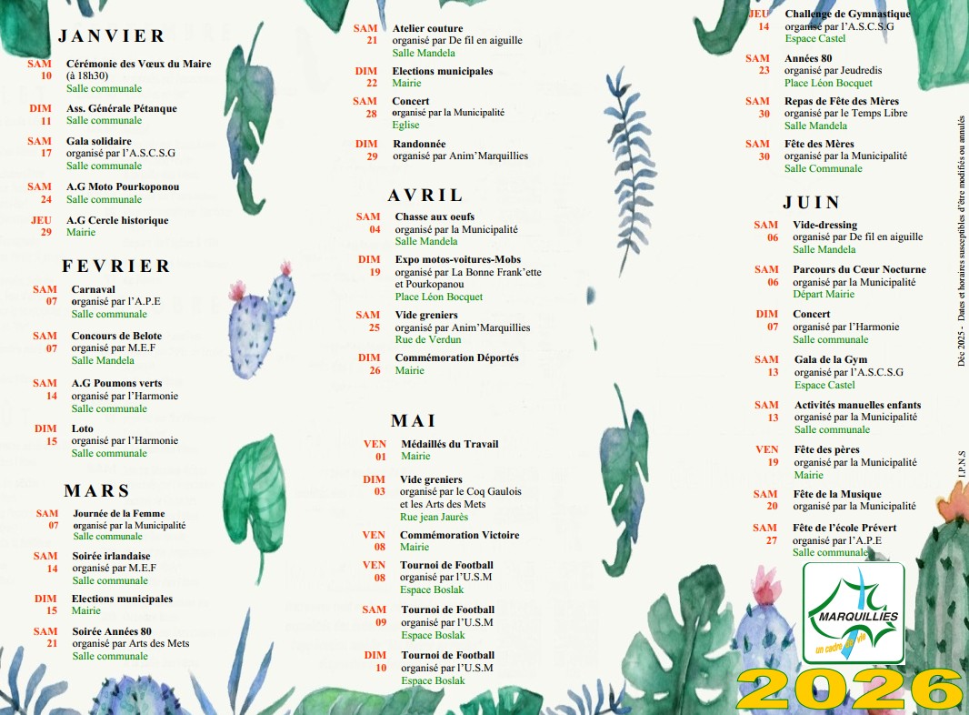 La municipalité est heureuse de vous annoncer que le calendrier des fêtes et cérémonies pour l’année 2026 est désormais disponible. N’hésitez pas à nous signaler toute erreur repérée, toute modification de date, toute reprogrammation, ou même la suppression d’un événement. Votre retour nous permettra de tenir un calendrier à jour et le plus fiable possible. Merci d’avance pour votre vigilance… et votre indulgence ! 🙏